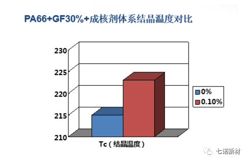 在没有加成核剂T1-11的情况下,由于冷却结晶温度远远高于纯的尼龙66的温度,就是说玻纤的存在是促进结晶,结晶的温度达到了215度;而在添加大约千分之一的成核剂T1-11后,温度由215度达到了225度,提高近10度。