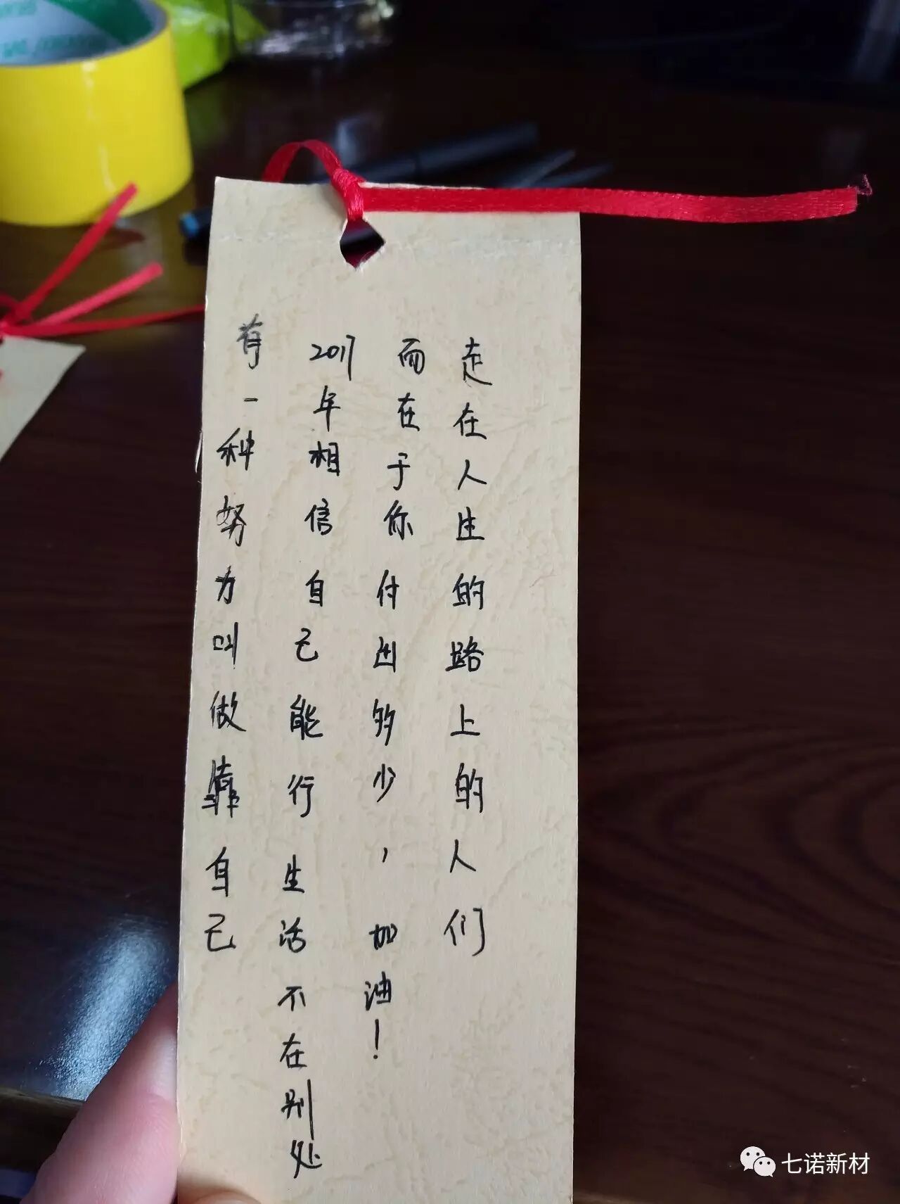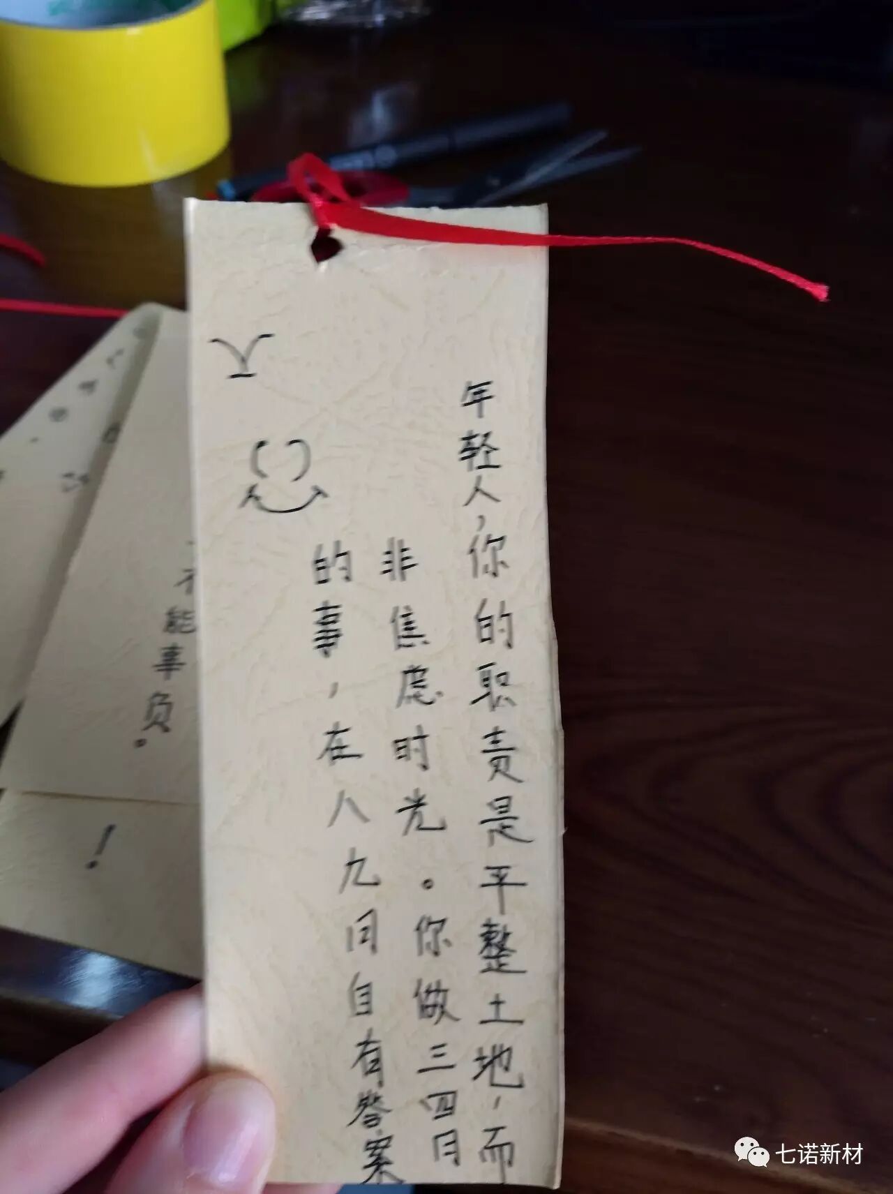 4月12号周三早会:又到了每周三的“七诺读书会”,本次的读书会内容是把优美名言,格言警句等制作成最特别的书签。 期初,小编给了他们笔和空白书签,任他们自由发挥。 大家互相交流,然后发挥创造力和构思书签内容,七诺人便将自己印象最深的或者最自己最有影响的一句话通过绘制书签的形式表达出来 下面我们是 我们七诺家族的书签作品 每个人的风格都不同, 有心灵鸡汤style的、 有励志style的、 有读书笔记style的...... 但都同样是用笔来描绘出自己心中的那份“童话” 将读书会形式多样化 激发七诺人的读书热情 形成良好的企业文化氛围 七诺读书会还在继续中......